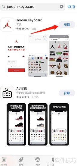 6、 界面跳转后会出现Jordan Keyboard应用,点击旁边的获取按钮即可开始下载。下载完成后,右侧显示打开字样,表示应用已成功安装,可随时启动使用。