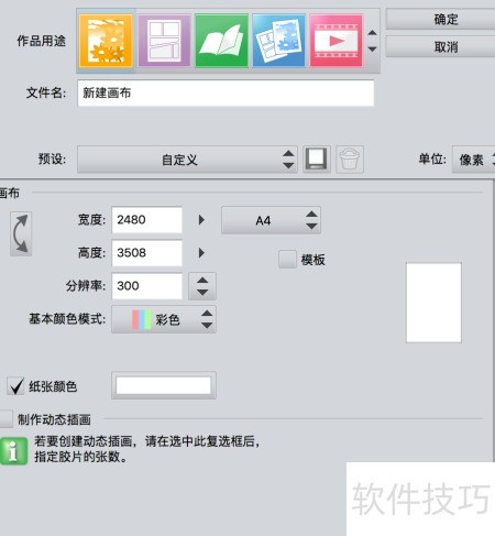 4、 可根据个人需要在选项中自定义设置画布尺寸与分辨率等参数。