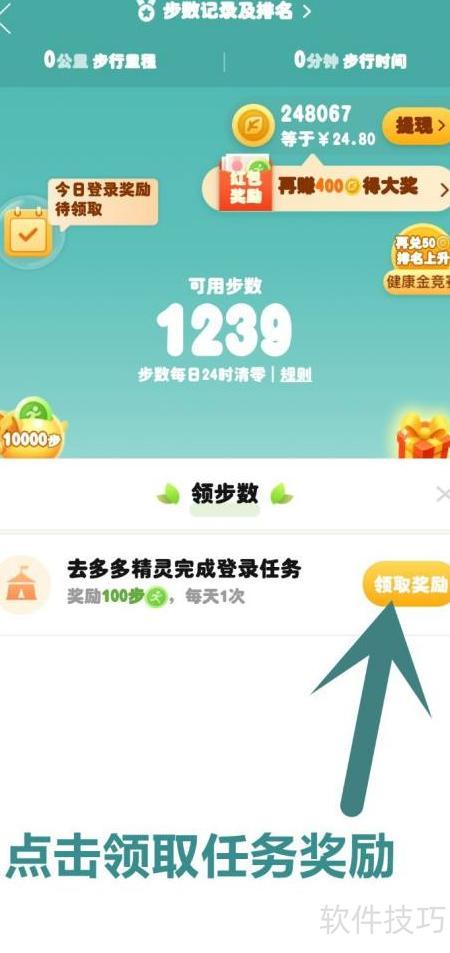 需先在我的步数任务中进入精灵页面,再完成登录任务,方可领取步数奖励,否则即使任务完成也无法在步数界面获取奖励。