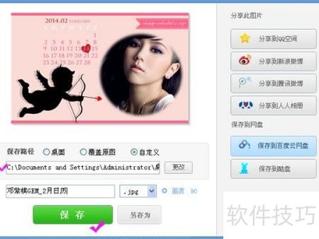 4、 点击保存与分享进入下一界面,在存放路径中选择一个便于查找的文件夹,还可根据需要修改文件名称。随后点击底部的保存或另存为,即可完成日历图片的保存操作。提示保存成功后,前往指定文件夹打开已生成的日历图片,若希望设为电脑桌面,只需右键点击该图片,选择设为桌面背景即可轻松完成设置。