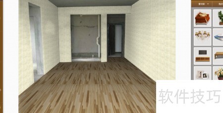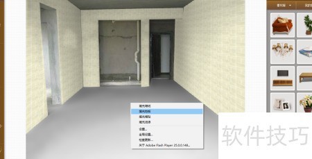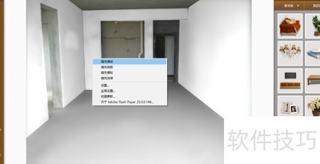 3、 点击墙面后右键选择填充墙纸,再右键点击地面并选择填充地板即可完成操作。