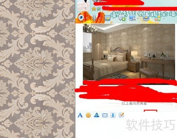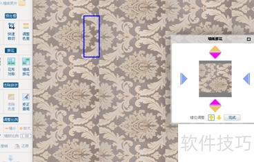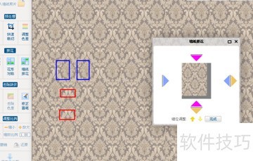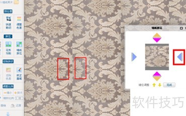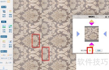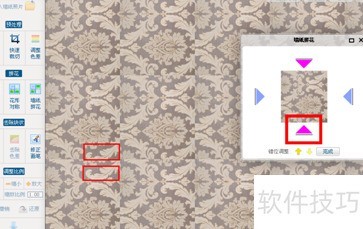 3、 先对齐墙纸上下的花型图案,再按红色按钮让花型重复部分完全重合。