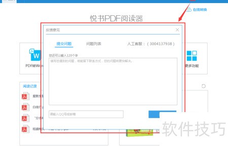 4、 软件首页右侧为主菜单栏,首个图标为反馈意见。用户在转换过程中遇到问题可在此提交,也可通过添加人工客服QQ号获取帮助。