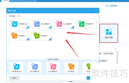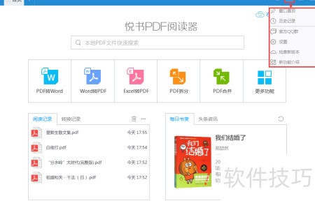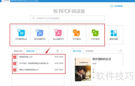 3、 在悦书PDF阅读器的软件首页转换功能区域,右侧设有更多功能选项,点击后可查看全部功能模块。用户可根据实际需要进行个性化设置,调整主板上的功能后,相关选项将直接显示在首页界面。该软件持续优化升级各项功能,未来还将陆续推出更多实用特性,致力于提升用户体验,建议用户保持关注,及时获取最新功能更新与服务改进。