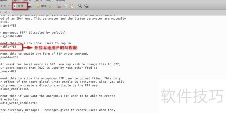 4、 打开终端,输入命令sudo gedit /etc/vsftpd.conf,找到write_enable=YES这一行,删除开头的号,取消注释,然后保存文件即可完成配置。