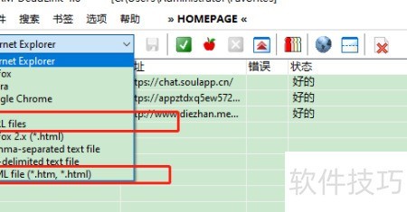 2、 启动AM-Deadlink工具,在浏览器选择界面中选取*.URL文件或HTML选项。
