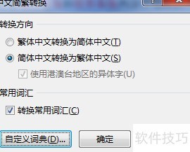 3、 在中文简繁转换窗口中,选择简体转繁体,勾选常用词汇转换,然后点击下方的自定义词典选项。