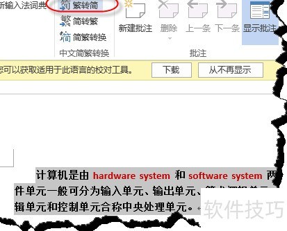 13、 重新选中文本,点击审核中的繁体转简体即可解决。