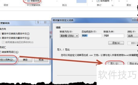 9、 在审核菜单中选择简繁转换,打开词典窗口后点击导入按钮进行操作。