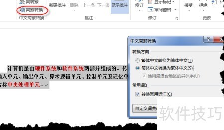 11、 选中文字后,点击审核中的简繁转换,在弹出的窗口中按提示操作并确认即可完成转换。