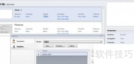 12、 在Articulate标签的工具区域中,点击幻灯片属性按钮以打开设置界面。如需添加背景音乐,可在该界面中点击资源库按钮,创建一个音频播放列表。随后逐一选中每张幻灯片,将其切换方式设为由用户控制,确保播放过程中可自主操作。在音频播放列表下拉选项中选择先前创建的音乐列表,使背景音乐在整个演示中连续播放。完成上述设置后,即可实现带背景音乐且按用户操作推进的幻灯片放映效果,提升展示的流畅性与观赏体验。