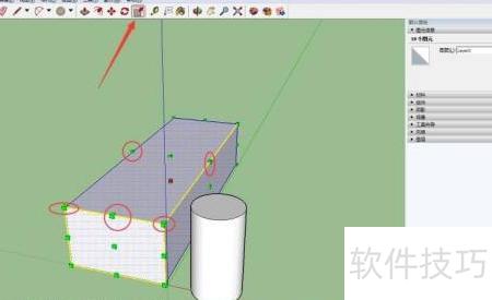 5、 如需修改已绘制的三维矩形图形,可先选中目标模型,再点击上方的缩放工具。此时模型表面将显示多个绿色控制点,通过鼠标拖动这些点即可自由调整图形形状。