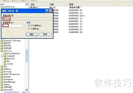 3、 首先了解如何移除开始菜单中的关闭系统选项。通过之前提到的方法,创建一个名为NoClose的键值,双击该键值,将数据设置为1即可隐藏该命令,设为0则恢复显示。