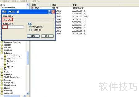 4、 可通过创建NoRun键值来隐藏开始菜单中的运行命令,双击该键值,将数据设为1即可隐藏,设为0则可恢复显示。