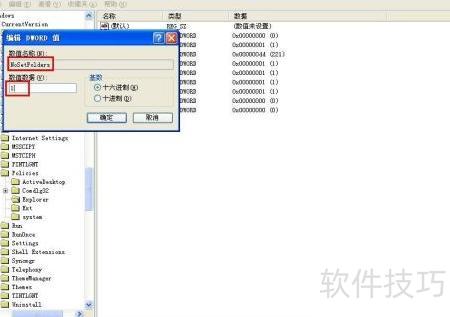 7、 在开始菜单中隐藏控制面板和打印机,可通过创建名为NoSetFolders的键值实现。双击该键值,将数值数据设为1即可隐藏,设为0则恢复显示。