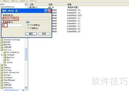 8、 在开始菜单中隐藏收藏夹命令,可通过创建名为NoFavoritesMenu的键值实现。双击该键值,将数据设置为1即可隐藏,设为0则恢复显示。