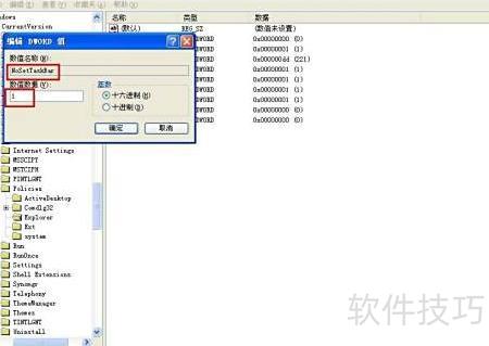 9、 禁止任务栏显示的方法:新建名为NoSetTaskBar的键值,双击该键值,将数值数据设为1即可隐藏任务栏,设为0则恢复显示。