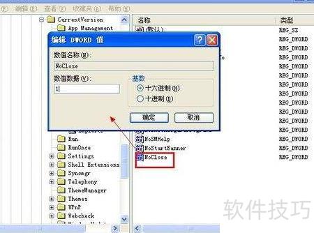 9、 将项目命名为NoClose,双击打开后将数值数据设为1(1表示禁用关闭系统功能,0则启用)。
