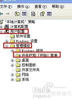 3、 进入用户配置,依次打开管理模板、任务栏和开始菜单。