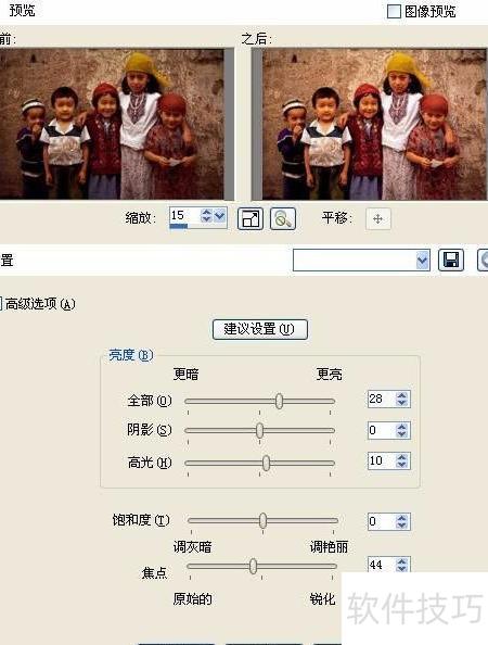 2、 从学习中心首页进入「调整」菜单,选择「智能照片修复」功能。可手动调节亮度和色彩,或直接选用「建议设置」后点击「确定」,即可快速优化照片至理想效果。