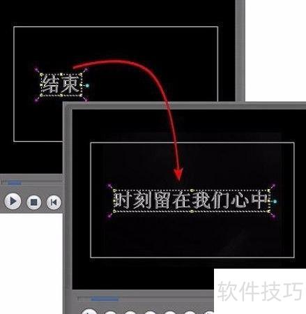12、 将飞梭栏拖到电子相册末尾,双击预览窗口中的默认文字TheEnd,将其替换为将这些记忆留存在我们心中,然后点击下一步。