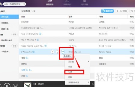 3、 选择想要分享的音乐,下拉菜单中点击分享选项即...