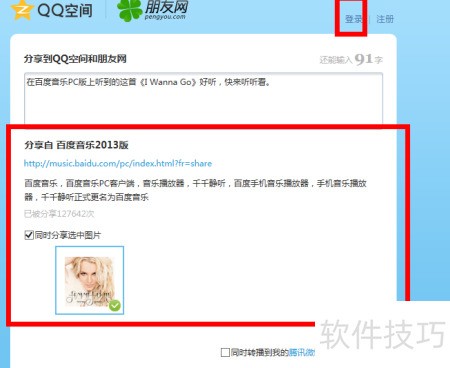 6、 例如将音乐分享到QQ空间,操作步骤见下图。