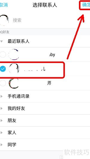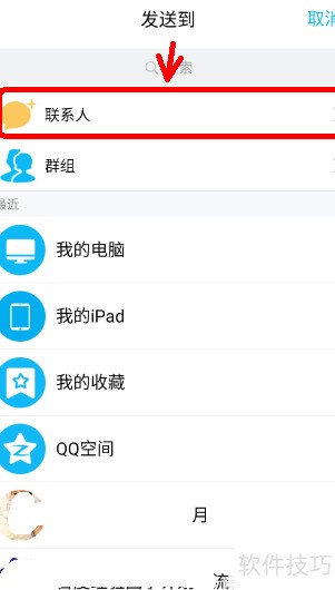 4、 手机随即跳转至QQ界面,可选择分享对象或群组。若分享给最近联系人,点击该联系人即可进入对话页面完成发送。