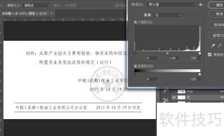4、 通过色阶面板的三个滑块调节红色印章至完全消失,最后确认操作。