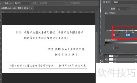 4、 通过色阶面板的三个滑块调节红色印章至完全消失,...