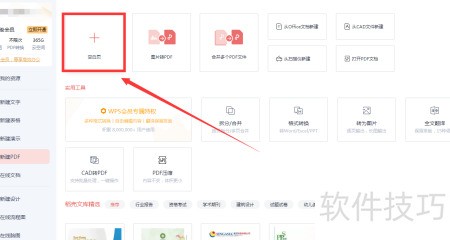 1、 启动电脑中的WPS软件,选择新建PDF功能,然后点击空白页添加新页面。