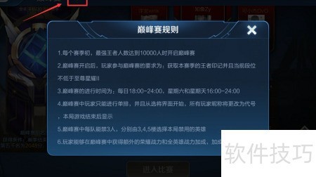 4、 参与巅峰赛需满足本赛季达到王者段位且当前段位不低于星耀二,还有其他多项规则。具体详情可点击巅峰赛界面左上角的?查看。