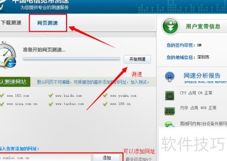 8、 进入网页测试标签页,切换至相应界面后点击开始测试按钮即可启动检测。在图1下方输入需测试的网址,网页测试即为网址测试功能。
