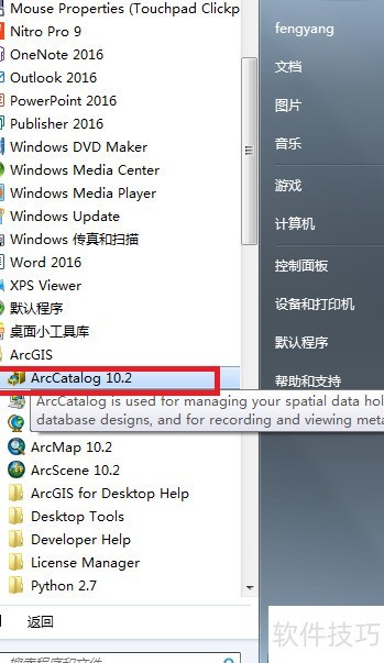 1、 点击电脑开始菜单,查找已安装的ArcGIS程序文件夹,选择其中的ArcCatalog 10.2并点击,即可启动并进入软件操作界面。