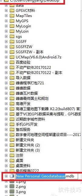 2、 在目标文件夹路径中右键点击,选择新建,然后点击个人地理数据库,即可在该路径下生成新的数据库文件。选中此文件后,通过右键菜单可对其进行重命名操作,方便后续管理与使用。