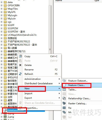 3、 选择新建数据库,右键点击后选择New,再单击Feature Class,即可打开新建要素类的对话框。