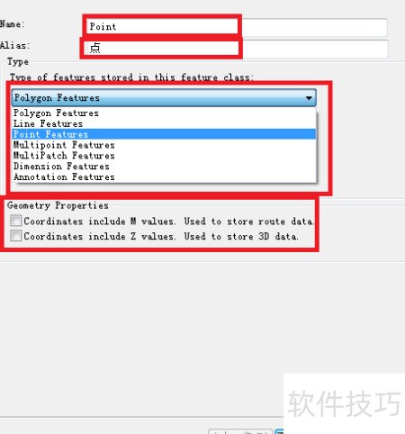 4、 在新建要素界面中,可创建点、线、面等几何类型。以点要素为例,选择Point Features,命名为Point,别名为点,完成设置后点击下一步继续操作。