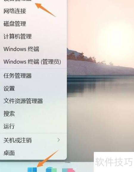 1、 按下键盘上的 Win + X 组合键,或右击任务栏中的 Windows 开始图标,在弹出的菜单中选择设备管理器即可打开相应界面。