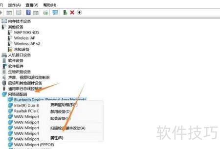 2、 在设备管理器中展开网络适配器,找到Bluetooth Device(Personal Area Network),右键点击该项,随后从弹出的菜单中选择属性选项,进入其设置界面进行查看或修改相关配置。