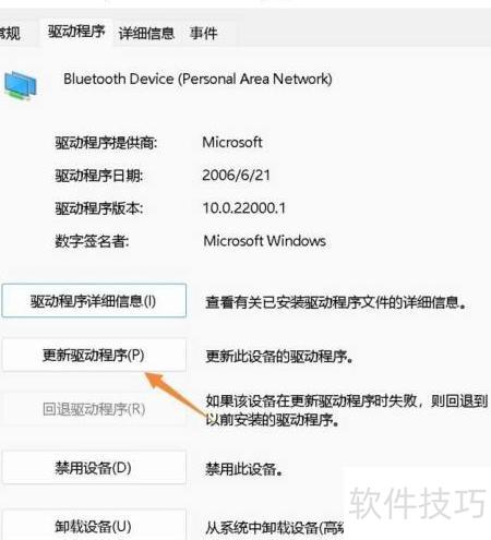 3、 在蓝牙设备(个人区域网络)的属性界面中,切换至驱动程序选项卡,随后点击下方的更新驱动程序按钮进行操作。