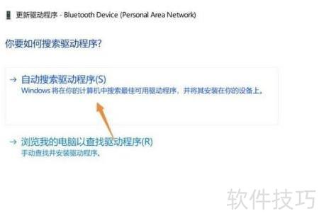 4、 在更新驱动程序 - Bluetooth Device(个人区域网络)界面中,可选择自动搜索最新驱动,或手动浏览计算机查找并安装相应驱动程序。