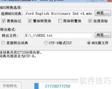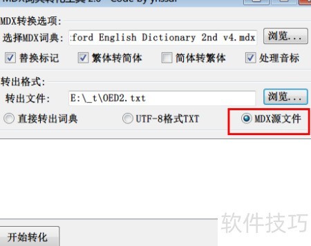 3、 将文件导出至E:\_tOED2.txt,下方复选框无需关注,可任意选择。请选择合适的导出格式,然后点击开始转换。稍等片刻后,即可生成MDX源文件,其内容如下所示。整个过程简单快捷,输出结果清晰明了,便于后续使用与处理。