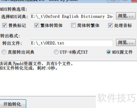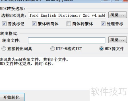 5、 解压MDD文件后,可直接点击开始转化,无需进行浏览操作。导出格式可根据需要自由选择。转出文件后的输入框内容也可随意填写,不影响转换过程,操作简便灵活,适合快速完成文件处理任务。