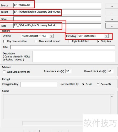 10、 可自行留空,根据实际需求填写内容。Encoding需依据MDX源文件的编码格式设定,此处为UTF-8。点击Start后稍等片刻,即可生成新的mdx和mdd文件。