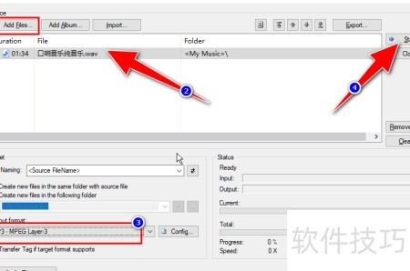 5、 点击Add Files...按钮,导入一个WAV格式的音频文件,然后将输出格式设置为MP3。确认设置无误后,点击Start按钮,系统便会开始转换,将所选的WAV文件转为MP3格式,等待片刻即可完成整个转换过程。