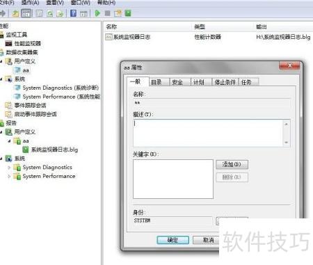 5、 现在开始使用我们创建的监视器。点击aa监视器,在右侧右键单击系统监视器日志,选择属性。此时会打开属性窗口,重点查看计数器添加部分。点击添加按钮,弹出可用计数器列表。勾选显示描述可查看每个计数器的具体说明,了解其功能后,选择所需项并点击添加完成操作。