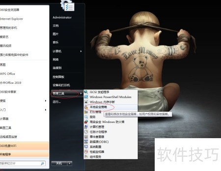 1、 点击开始菜单,进入管理工具中的本地安全策略选项。