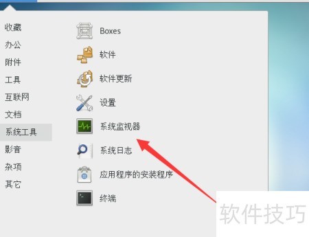 1、 进入系统后,选择应用程序中的系统监视器功能。