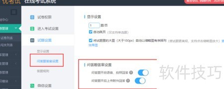 1、 点击右侧试题设置中的问答题答案设置,开启语音和拍照功能,如需上传附件可同时勾选,完成后保存设置即可。