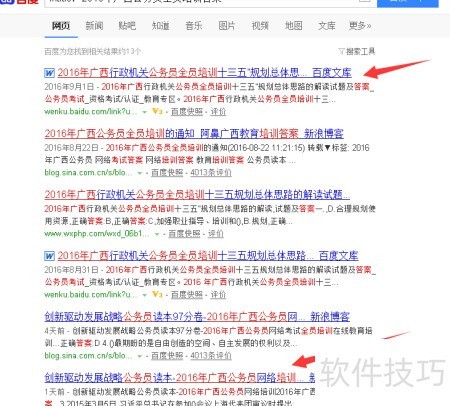 4、 搜索2016年广西公务员网络培训答案,可在百度中输入intitle指令查找相关网页内容。